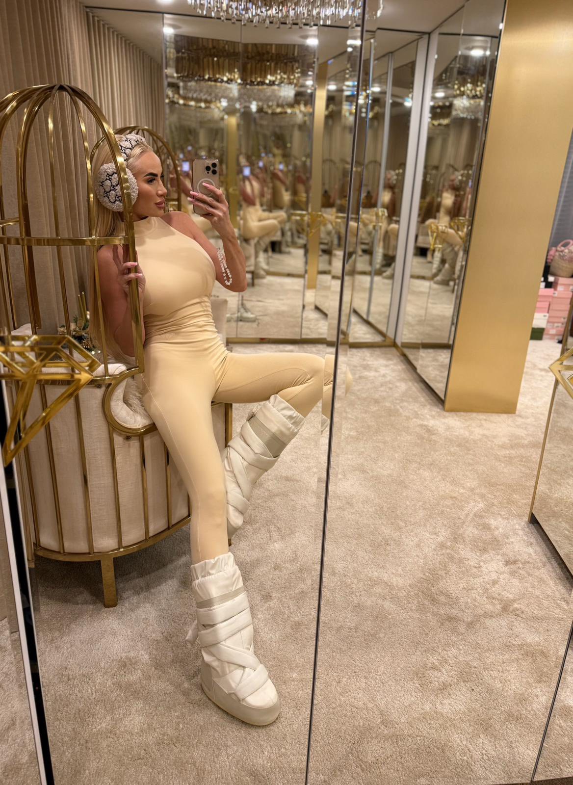 Długi dopasowany kombinezon wykonany z niezwykle przyjemnej w dotyku i elastycznej dzianiny w odcieniu wanilii. Model bez rękawów ze stójką. Zapinany jest na suwak z tyłu, który zaczyna się na wysokości bioder. Subtelny element logo w postaci haftowanego diamentu w kolorze tkaniny znajduje się pod talią po lewej stronie.