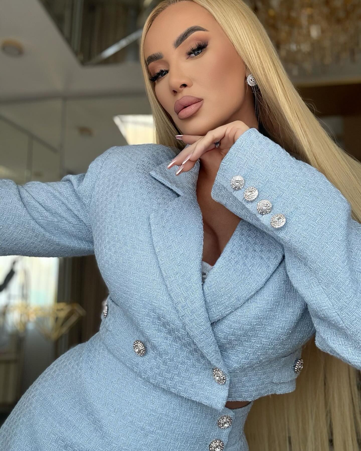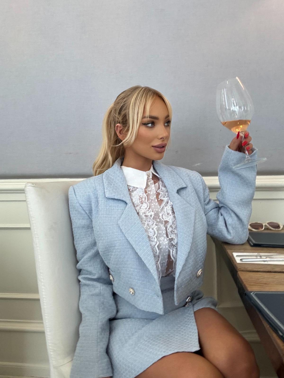 Marynarka o krótszym, luźniejszym kroju wykonane z mięsistego tweed’u z domieszką bawełny w pięknym błękitnym kolorze. Krój z kołnierzem, klapami z wszytymi poduszkami na ramionach, które dodają elegancji. Zapinana jest z przodu na dwurzędowe, srebrne guziki. Element guzików znajduje się także na dole rękawów w mniejszej wersji. Dodatkowo po bokach posiada paski z tymi samymi guzikami, co daje możliwość regulacji dopasowania w talii i możliwość jej wytaliowania. Dolna część marynarki z tłu posiada wszyty elastyczny ściągacz. Model z błękitną podszewką.