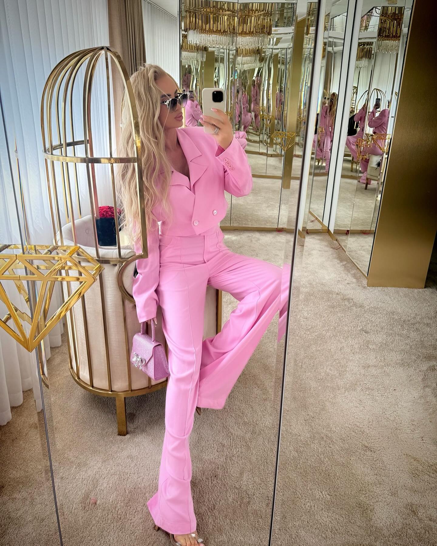 Marynarka o nieco krótszym kroju wykonana z lejącej się, eleganckiej tkaniny w pięknym odcieniu delikatnego różu. Świetny, unikatowy krój bez kołnierzyka, dzięki czemu tworzy się dekolt w kształcie litery V. Zapinana jest na dole na różowe logowane guziki. Element guzików znajduje się także na dole rękawów w mniejszej wersji. Model na poduszkach, które dodają elegancji. Produkt z logowaną podszewką w różowym kolorze.