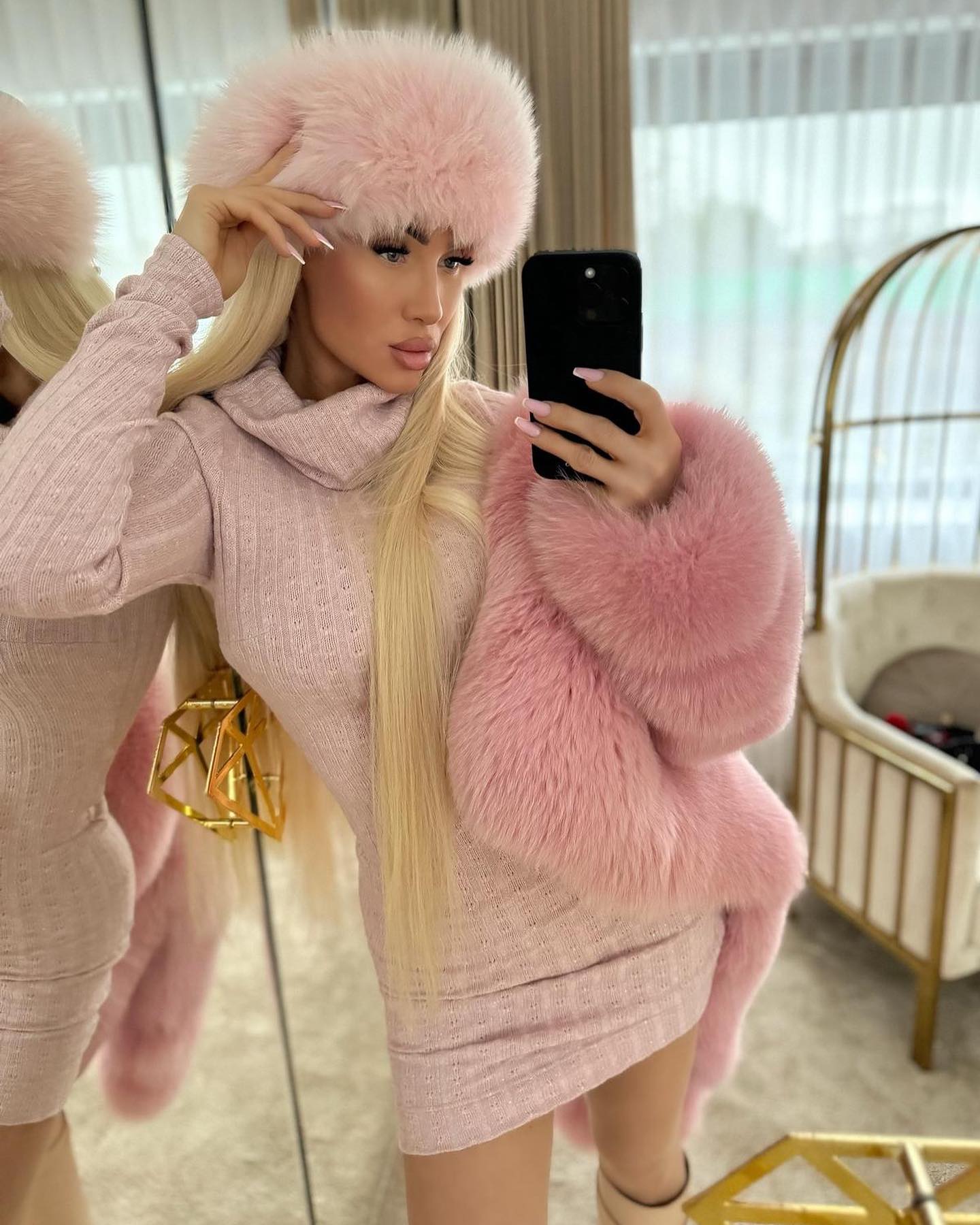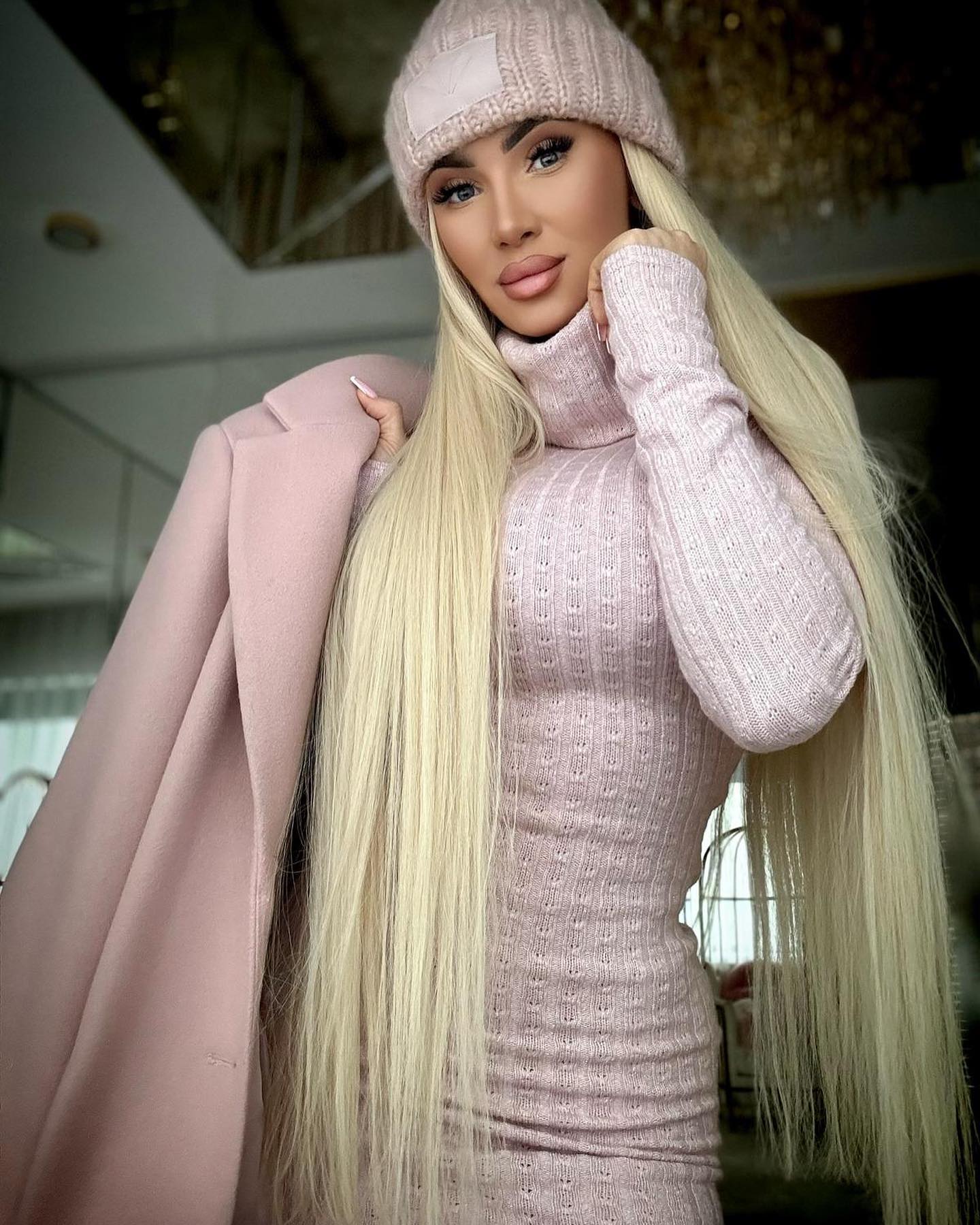 Sukienka o dopasowanym kroju wykonana z miłej w dotyku i bardzo elastycznej dzianiny przeplatany subtelną mieniącą się nicią w srebrnym kolorze, dając delikatny efekt. Model z podwójnym golfem z możliwość wywinięcia.